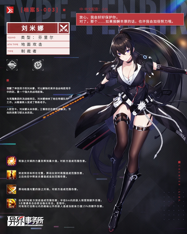 觉醒了神圣因子的刘米娜「芬里尔·觉醒刘米娜」将于本周四更新维护后正式实装。觉醒刘米娜可以解除约束并自由挥动手中的剑,是一位强大的战场前锋。角色专属雇佣概率限时UP卡池将开放于“秘密雇佣”系列卡池,老板可使用道具“秘密雇佣契约书”进行觉醒刘米娜的雇佣。