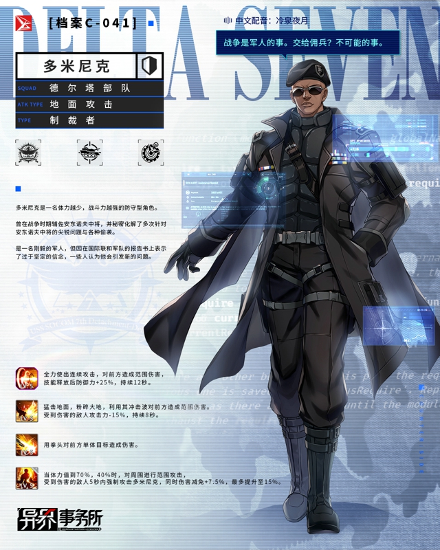 新SSR角色“多米尼克”将于本周四更新维护后实装,多米尼克隶属于德尔塔部队,是一名体力越少,战斗力越强的防守型角色。此外,员工专属的雇佣概率限时UP卡池将同步开放。