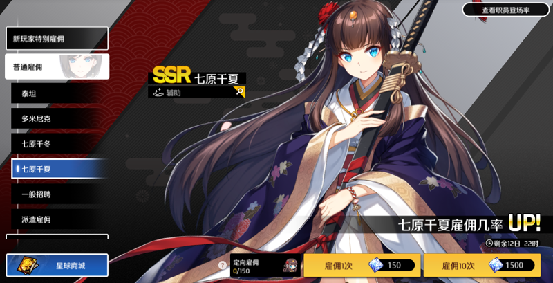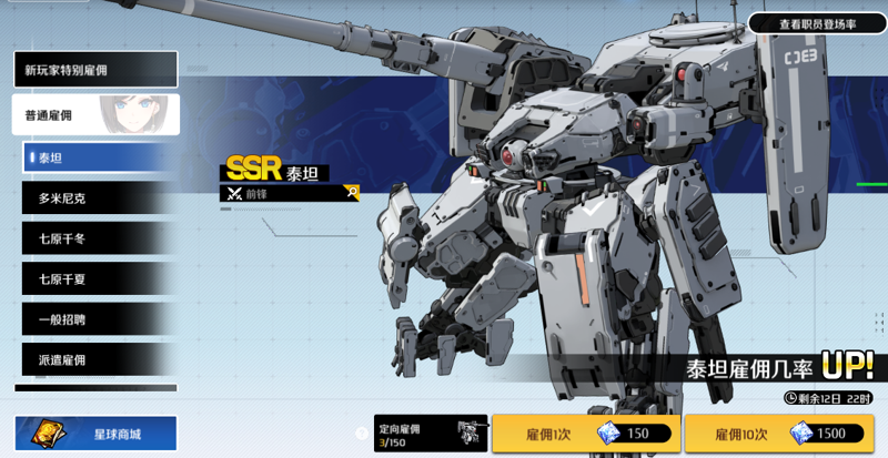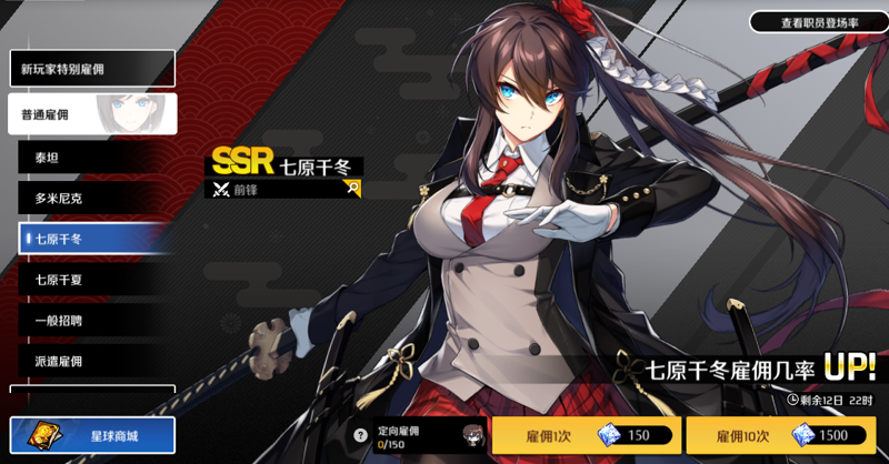 本周为七原千冬、七原千夏以及泰坦,三位SSR角色开放雇佣概率限时UP卡池。三位角色分列入三个独立卡池,老板可根据公司战备情况前往雇佣。