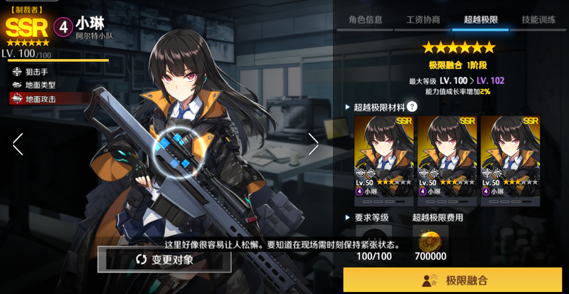 老板可消耗对应数量的“融合核心”或将进行融合操作员工的相同单位,来进行融合操作。每次成功融合时,员工最高等级都会增加2,能力值成长率增加2%。极限融合最多可进行5次,即最高可提升至110级。